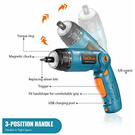 📌【POIGNÉE À 3 POSITIONS + RÉGLAGE DU COUPLE RÉGLABLE】 La conception de la poignée à 3 positions est distinctive sur le marché : 100° comme poignée pistolet, 140° pour un espace de travail plus étroit et 180° comme tournevis droit, un tournevis répond à diverses exigences et permet un contrôle plus facile pour un vissage efficace ; 6 réglages de couple réglables (couple de sortie de 1 N.m à 4 N.m), vous pouvez ajuster le couple pour différents matériaux ou projets, vous aidant à éviter de dénuder les vis ou à éviter la surpuissance lors de fixations délicates.