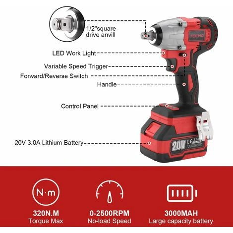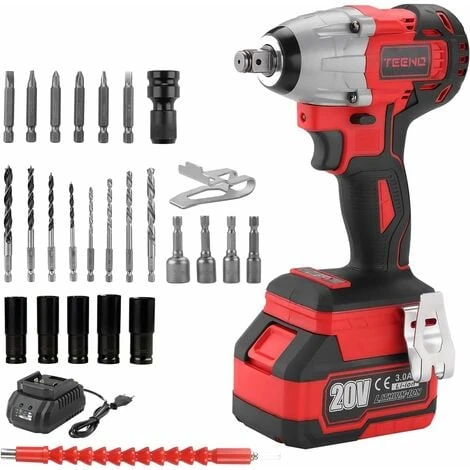 【Cadeau parfait】 1 clé à chocs sans fil TEENO, batterie Li-ion 3,0 Ah, 1 chargeur, 5 clés à douille (18/19/19/20/22 mm), 6 embouts à vis, 8 forets, 4 × six pans creux, 1 × arbre à cardan, 1x adaptateur, 24 × mois de garantie.