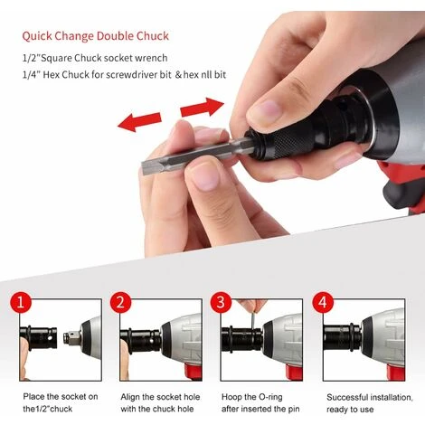 Cette perceuse électrique est équipée d’un adaptateur multifonctionnel, qui peut être utilisé pour toutes les perceuses de cette boîte à outils, à l’exception du manchon. Il a les fonctions de percer du bois, percer du métal, percer un mur, serrer/desserrer des vis, etc.