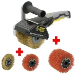 PACK composé des références FARTOOLS 115027 + 110898 + 110886 + 110899 : REX120C RENOVATEUR EXTERIEUR / BROSSE METALLIQUE DE PRECISION / BROSSE A LANIERES ABRASIVES / BROSSE A LANIERE ABRASIVE DE PRECISION Pour le décaper, dégriser, décrasser du bois, du métal ou de la pierre, sur surfaces planes ou complexes, y compris dans les rainures ou angles difficiles d’acces