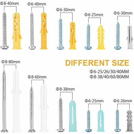 La description Avantage: bonne élasticité, bonne résistance à la traction, résistance aux chocs, pas de rupture, dureté élevée, pas de rouille, forte force d’expansion, peut éviter de glisser dans le trou du mur, produits beaux et pratiques, petite taille, grande charge, large éventail d’utilisations, installation rapide et facile, améliorer l’efficacité du travail et la qualité de l’installation Le kit comprend Jaune 6 ** 25 10PCS avec vis autotaraudeuses 6 * 30 10PCS avec des vis autotaraudeuses 6 * 40 10PCS avec des vis autotaraudeuses 8 * 40 10PCS avec des vis autotaraudeuses Bleu 6 * 25 10PCS avec des vis autotaraudeuses 8 * 38 10PCS avec vis autotaraudeuses gris 6 * 26 10PCS avec des vis autotaraudeuses 6 * 30 10PCS avec des vis autotaraudeuses blanc 8 * 60 10PCS avec des vis autotaraudeuses 8 * 80 10PCS avec des vis autotaraudeuses Instructions Percer le trou avec un foret efficace Nettoyer le trou Incorporer l’ancre à travers l’objet à réparer Visser les ancres Précautions Les ancrages en nylon nervuré (plastique) fonctionnent avec diverses vis à tôle de diamètre. Idéal pour l’ancrage dans le béton, la brique ou le panneau mural. L’ancre est résistante à la corrosion. Un trou pré-percé est requis.
