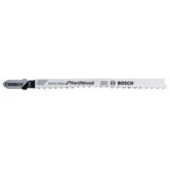 La lame de scie sauteuse T 308 BOF Extra-Clean for Hard Wood de la marque Bosch est destinée pour effectuer des découpes arrondies très nettes et sans bavures dans le bois. Grâce à sa denture à corps effilé-conique et affûtée avec précision, elle permet des découpes sans éclats des surfaces inférieures et supérieures. Elle favorise la découpe des matériaux comme les bois durs et les matériaux de menuiserie abrasifs grâce à la composition Bimétal de la denture progressive en acier trempé à coupe rapide (HSS) et du corps en acier à haute teneur en carbone (HCS) flexible. En outre, la lame possède une denture à pas fin de 2,2 mm et une géométrie des dents taillée et affutée ce qui permettant la découpe de matériaux solides dérivés du bois de 5 à 50 mm d’épaisseur. Elle convient avec les scies sauteuses avec systèmes de fixation en T.