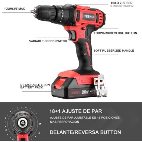 La perceuse sans fil dispose de 18 réglages de couple différents et de fonctions de perçage. Il peut être utilisé pour percer le bois, le métal, le plastique et toutes les activités d’un tournevis.