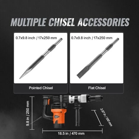 - Diverses Utilisations : Les marteaux demolisseurs comprennent 2 burins (burin plat et a pointe). Il est parfait pour la demolition, le creusement de tranchees, le burinage et le percage de trous dans le beton, les blocs, les briques et les carrelages. Il est egalement ideal pour diverses applications telles que les canalisations, les installations mecaniques, la construction deinstallations de drainage, la decoration interieure, et bien plus encore !