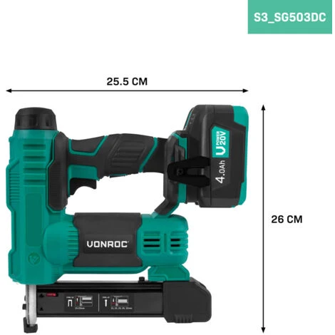 Cette agrafeuse-cloueuse sans fil est livré avec batterie 4.0Ah et chargeur. En effet, l’agrafeuse fait partie de la gamme VPower 20V VONROC. Vous pouvez commander en option la batterie interchangeable 2.0Ah ou 4.0Ah. Si vous souhaitez combiner l’agrafeuse sans fil avec une autre machine de la gamme VONROC VPower 20h il vous faudra une batterie et un chargeur! Choisissez uniquement ce dont vous avez besoin, et ce, à un prix compétitif !