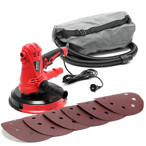 | Accessoires | 1× poignée latérale retirable 1× sac collecteur des poussières avec bandoulière 1× tuyau d’aspiration flexible de 2 m 1× adaptateur de connexion de tuyau 8× papier abrasif correspondant (2× G150, 2× G180, 2× G240, 2× G400) 1× clé Allen 1× balai de charbon |